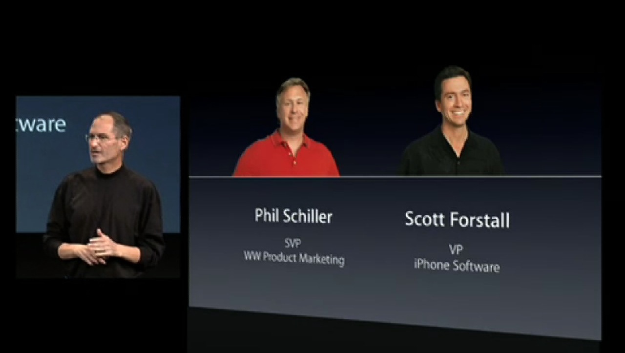 Steve Jobs présente ensuite les deux principaux intervenants : Phil Schiller et Scott Forstall.